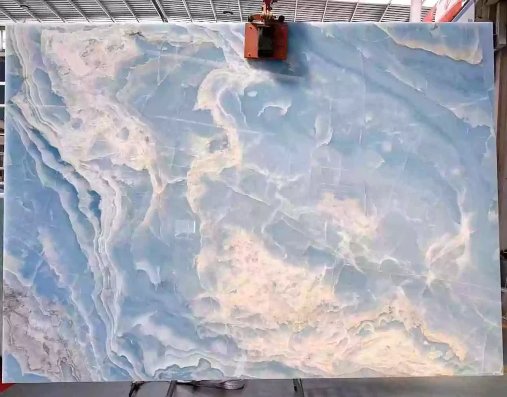 Blue Onyx marble, originating from quarries around the world including argentina, Iran and mexico is a mesmerizing natural stone distinguished by its striking blue hues and translucent properties. It features captivating swirls and patterns of varying shades of blue, creating a sense of depth and movement within the stone. The translucent nature of Blue Onyx allows light to penetrate, resulting in a stunning visual effect that adds a touch of elegance to any space. Ideal for statement pieces such as countertops, accent walls, and decorative features, Blue Onyx marble infuses interiors with a sense of luxury and sophistication.